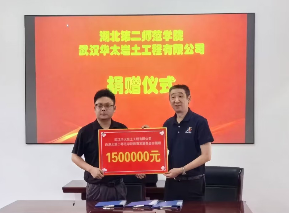 2024年6月21日,武汉华太岩土工程有限公司向湖北第二师范学院教育发展基金会捐赠150万元,用于支持学校的建设与发展,捐赠仪式在学校会议室隆重举行。